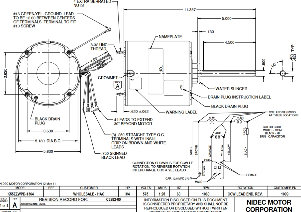 - 3/4 hp 1075 RPM, 1.25 amps 575V Volts 60 Hz PSC Motor