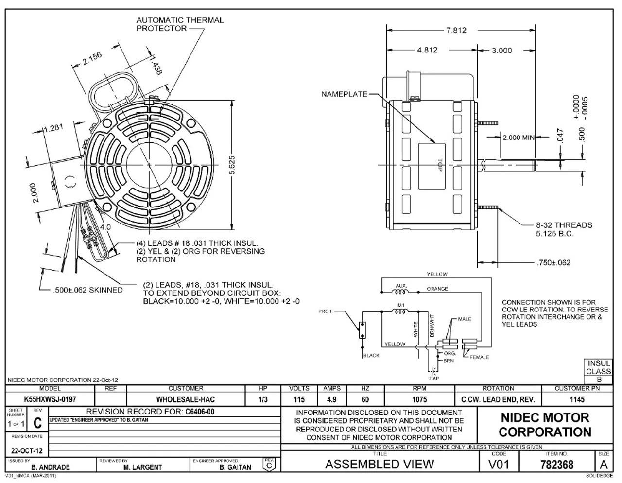 Permanent Split Capacitor Motor. Automatic Overload Protection. Continuous Duty; Open Enclosure; 40C Ambient Temperature; 15″ Leads, 60 Hertz. K055WSJ0197012B.