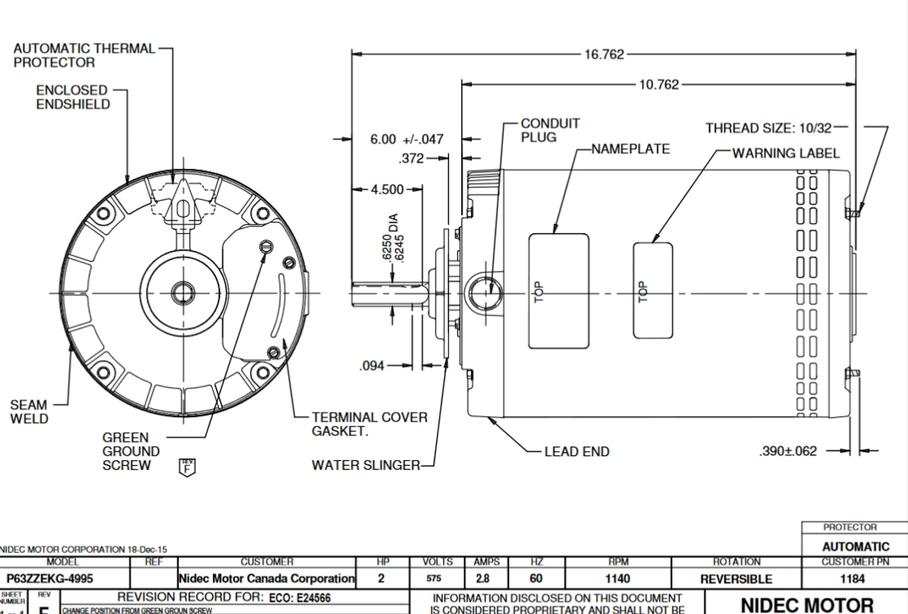 - 2 hp 1140 RPM, 2.8 amps 575V Volts 60 Hz 3-Phase Motor