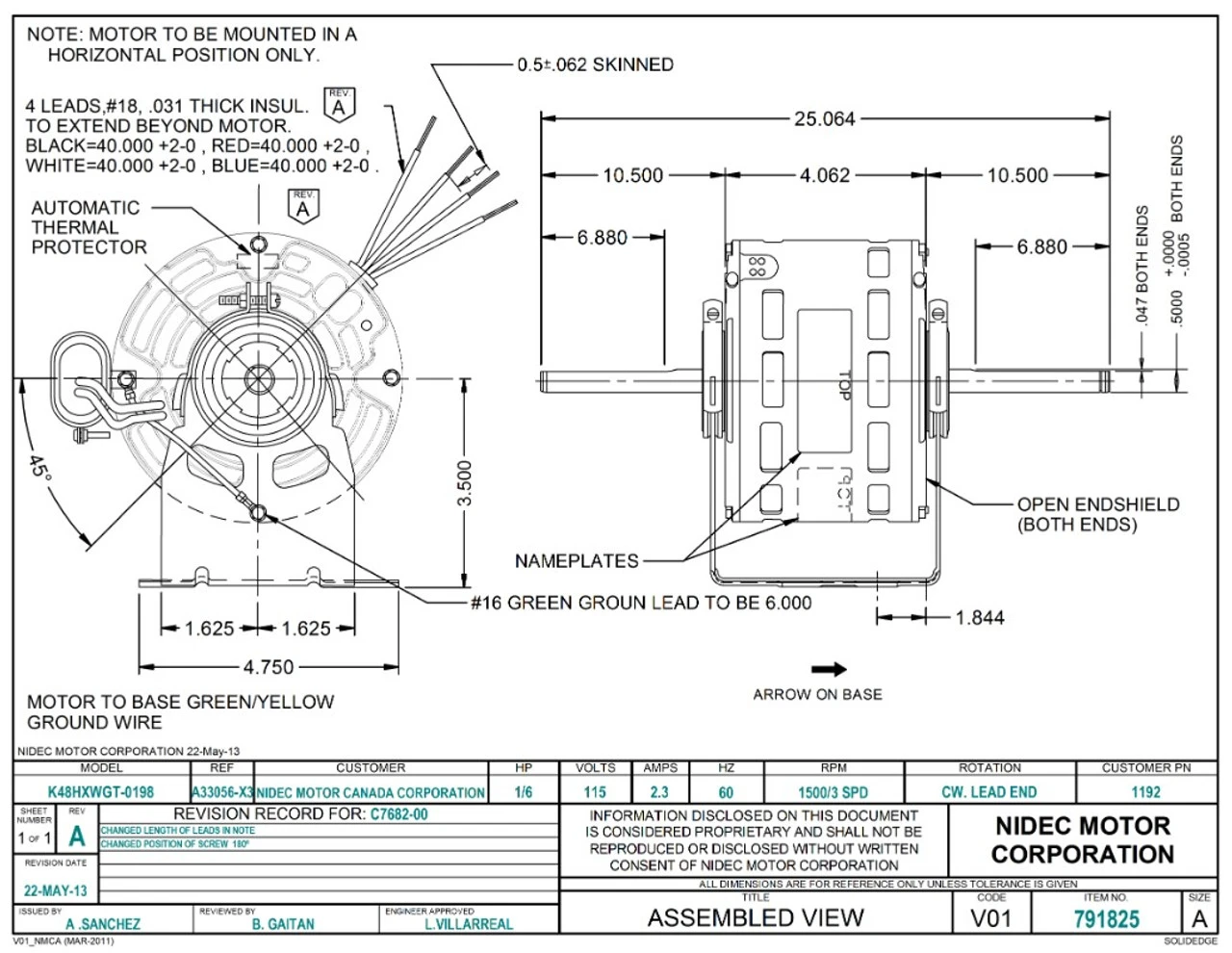 Permanent Split Capacitor Motor. Automatic Overload Protection. Continuous Duty; Open Enclosure; Class B Insulation; 40C Ambient Temperature; 40″ Leads. Application: Direct drive blower. K048WGT0198013B. Suggested after market replacement for IEC unit motors: 955