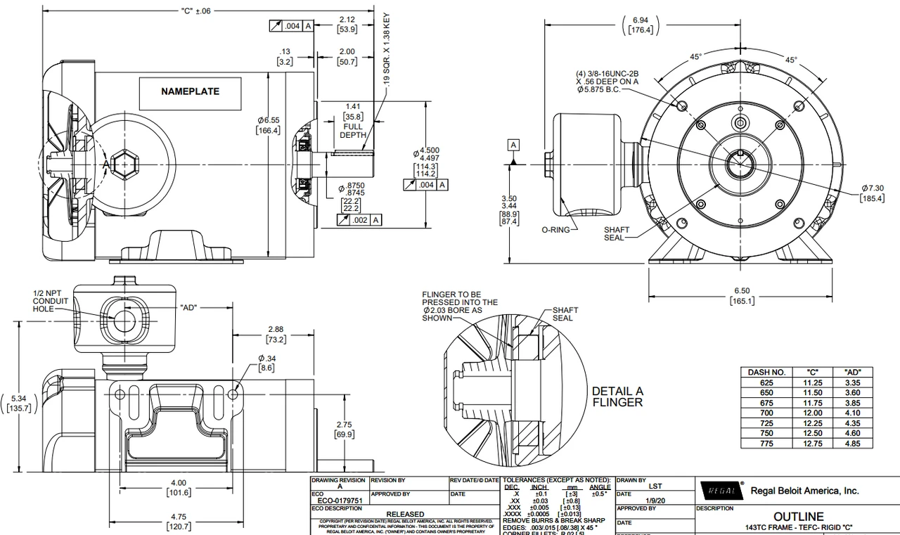 - NEMA 143TC frame, C-face, Stainless Steel Keyed Shaft 7/8″ Diameter x 2 1/8″