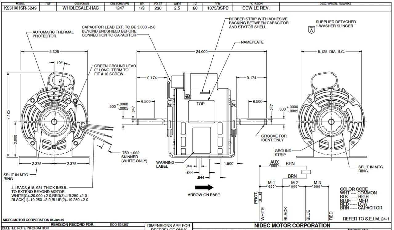 Direct Drive Fan Motor for central HVAC systems. Wiring diagram on motor name plate. OAO = Open Air-Over, KD55HSR5249R11B