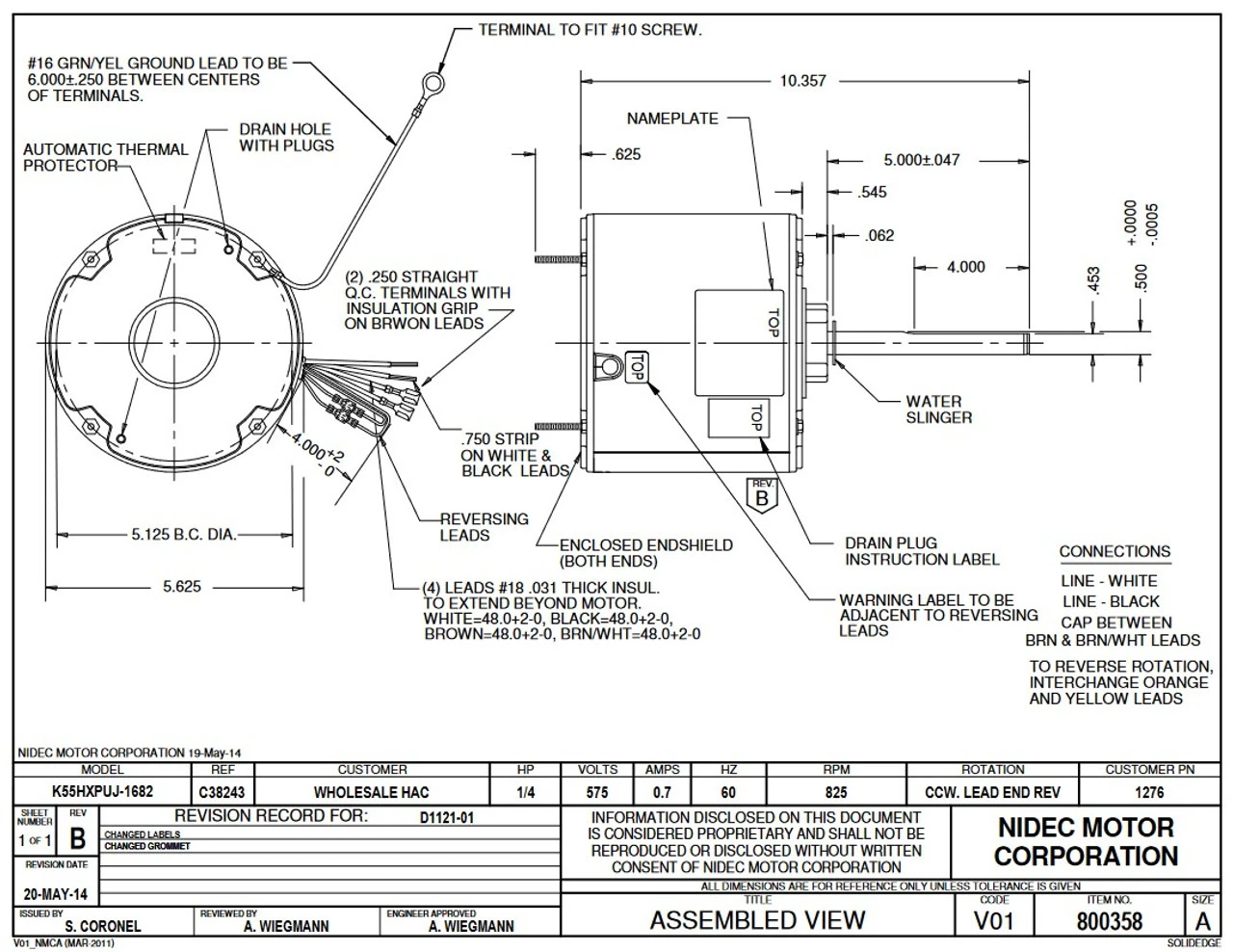 Permanent Split Capacitor Motor. Automatic Overload Protection. Continuous Duty; Totally Enclosed Air Over Enclosure; Class B Insulation; 60C Ambient Temperature; 48″ Leads, K055PUJ1682012B