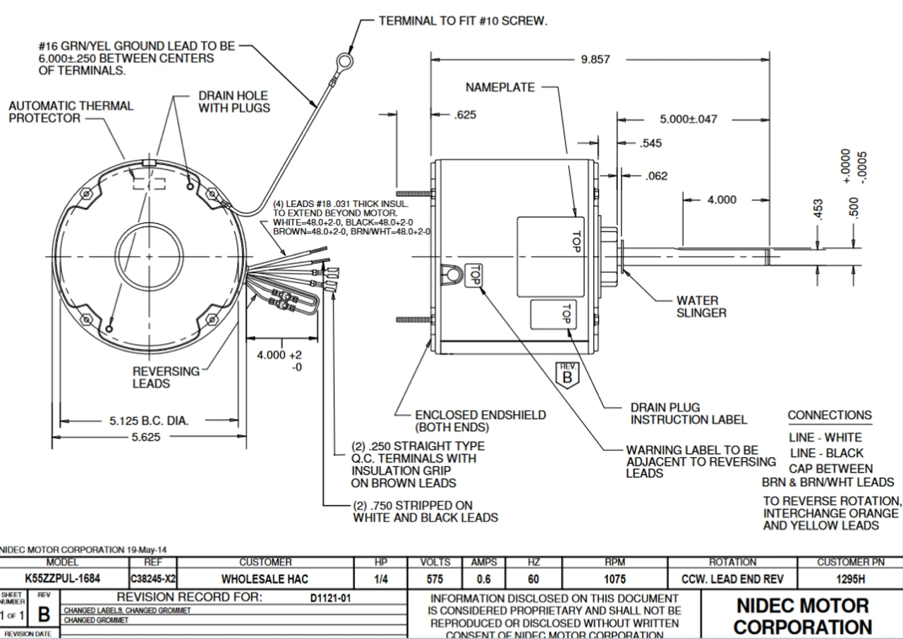 Condenser Fan Motor for hot environments. Wiring diagram on motor name plate. TEAO = Open Drip Proof, K055PUL1684012B