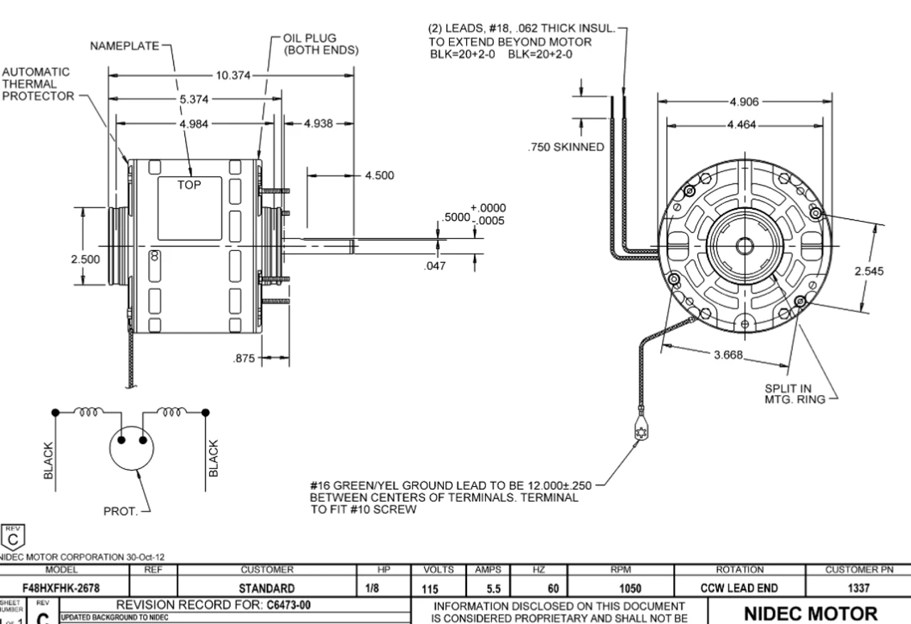 Direct Drive Fan Motor for central HVAC systems. Wiring diagram on motor name plate. OAO = Open Air Over, F048FHK2678021B