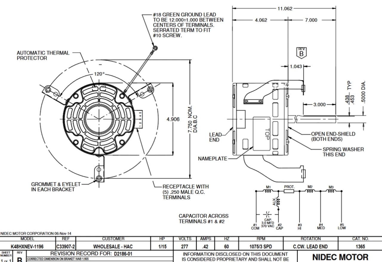 1/5 hp 1075 RPM, 0.42 amps 277V Volts 60 Hz PSC Motor