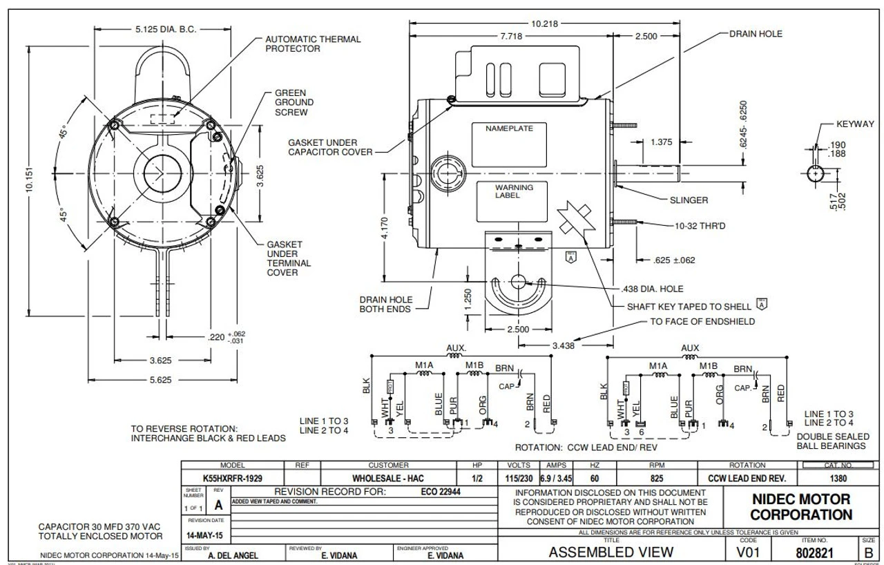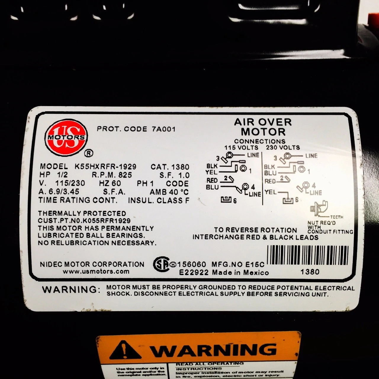 - 1/2 hp 825 RPM 1-Speed 6.9/3.45 amps 115/230VÂ