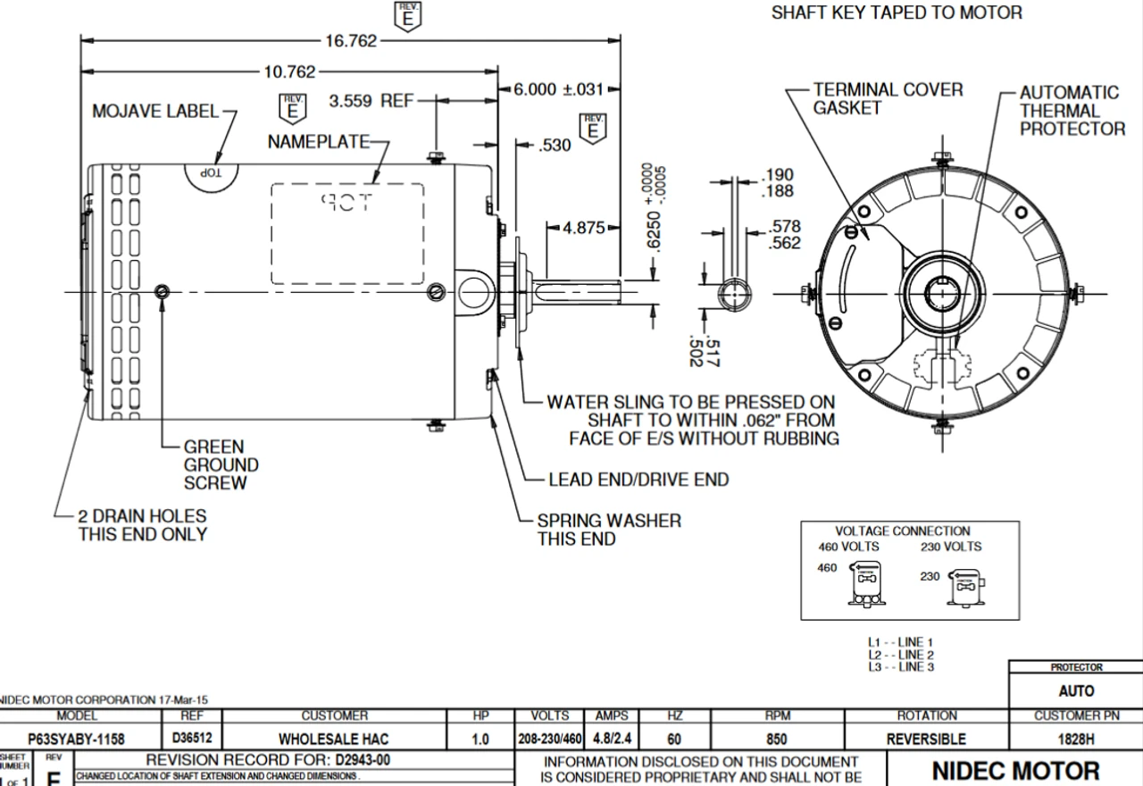 Commercial Condenser Fan Motor for higher than normal temperature environments. Wiring diagram on motor name plate. OAO = Open Air-Over, P063ABY1158015B
