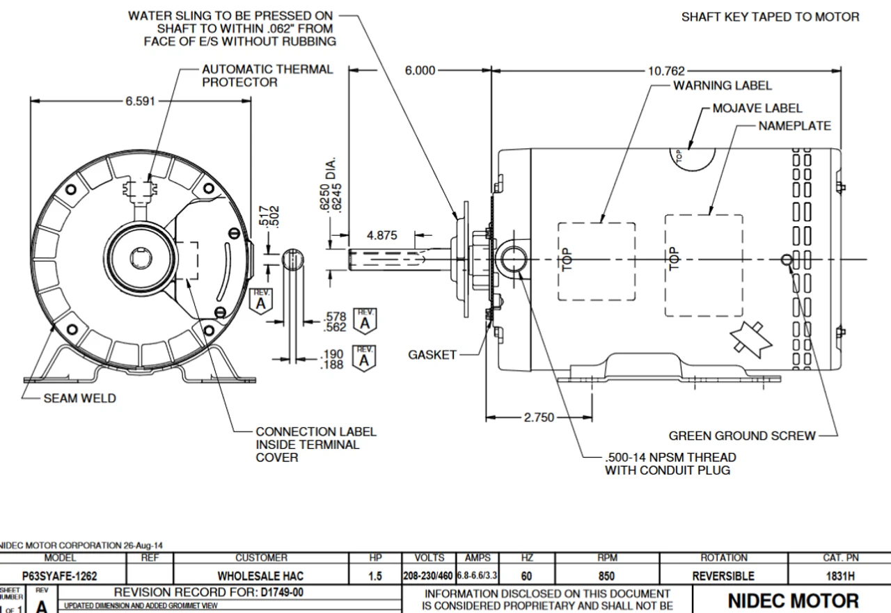 - 1 1/2 hp 850 RPM, 6.8-6.6/3.3 amps 208-230/460V Volts 60 Hz 3-Phase Motor