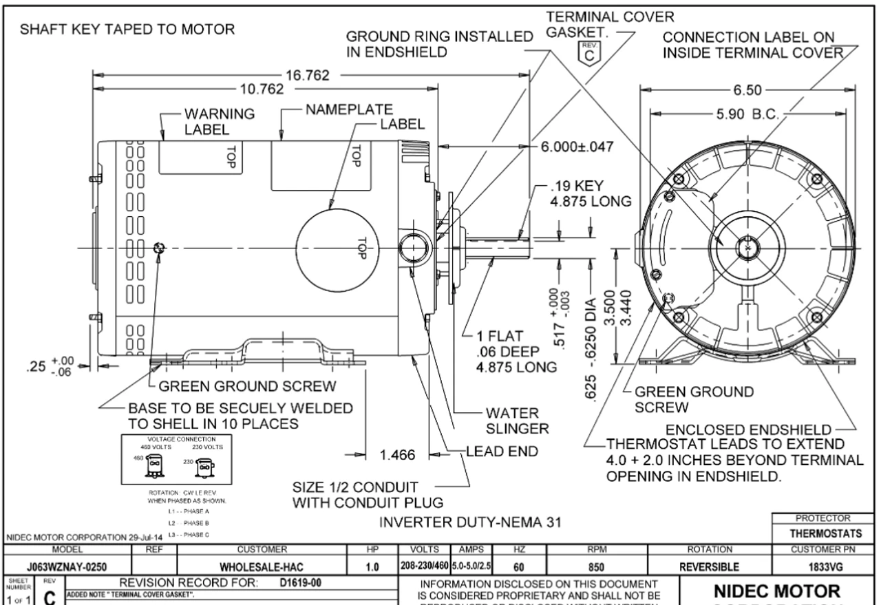 - 1 hp 850 RPM, 5.0-5.0/2.5 amps 208-230/460V Volts 60 Hz 3-Phase Motor