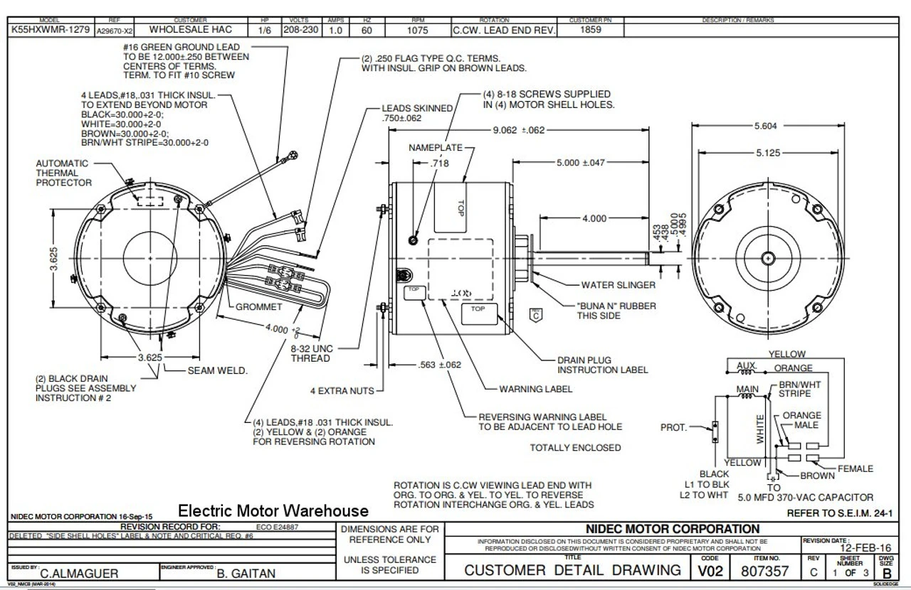 Permanent Split Capacitor Motor. Automatic Overload Protection. Continuous Duty; Totally Enclosed Air Over Enclosure; Class B Insulation; 60C Ambient Temperature; 30″ Leads, K055WMR1279012B