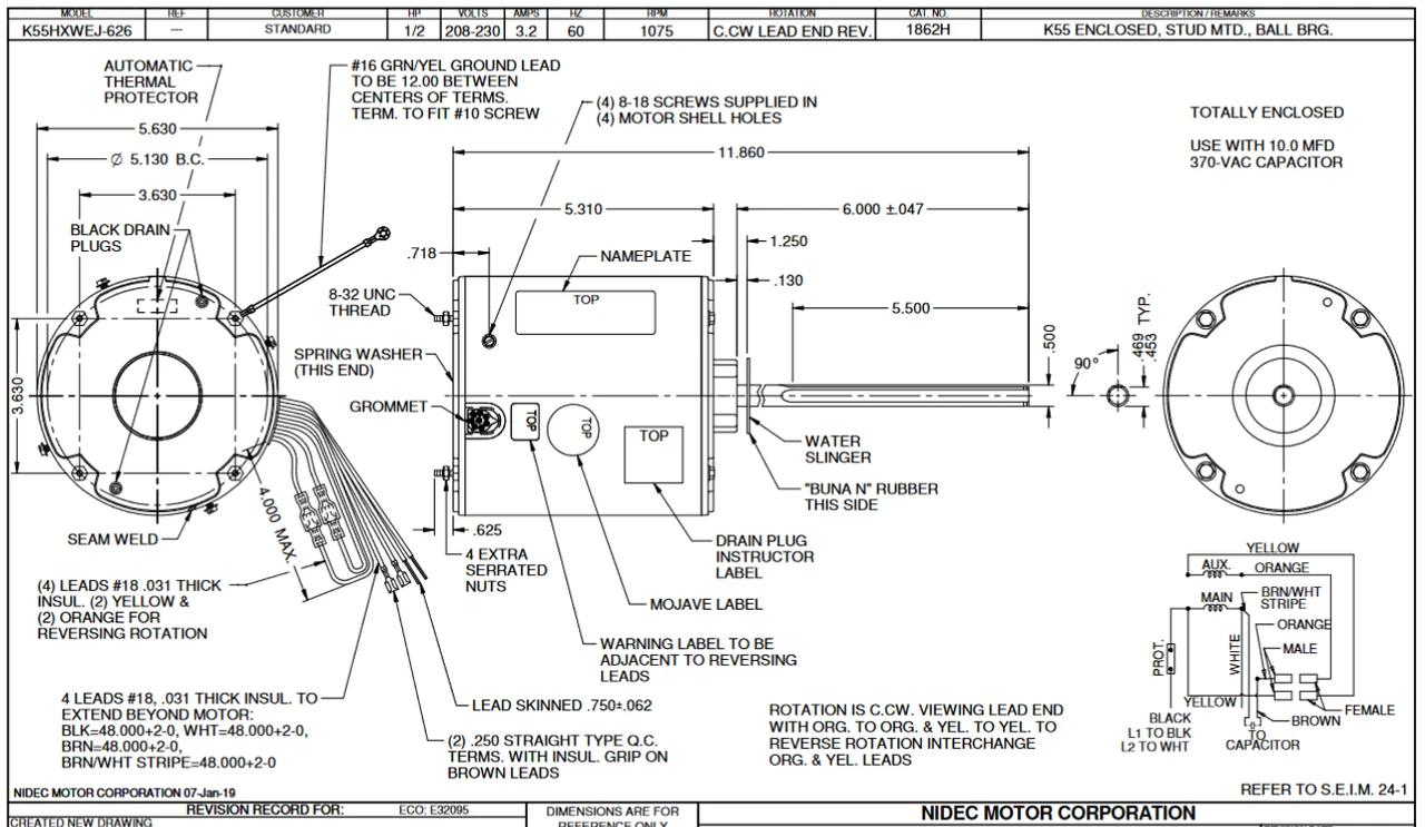 Condenser Fan Motor for hot environments. Wiring diagram on motor name plate. TEAO = Open Drip Proof, K055WEJ0626012B