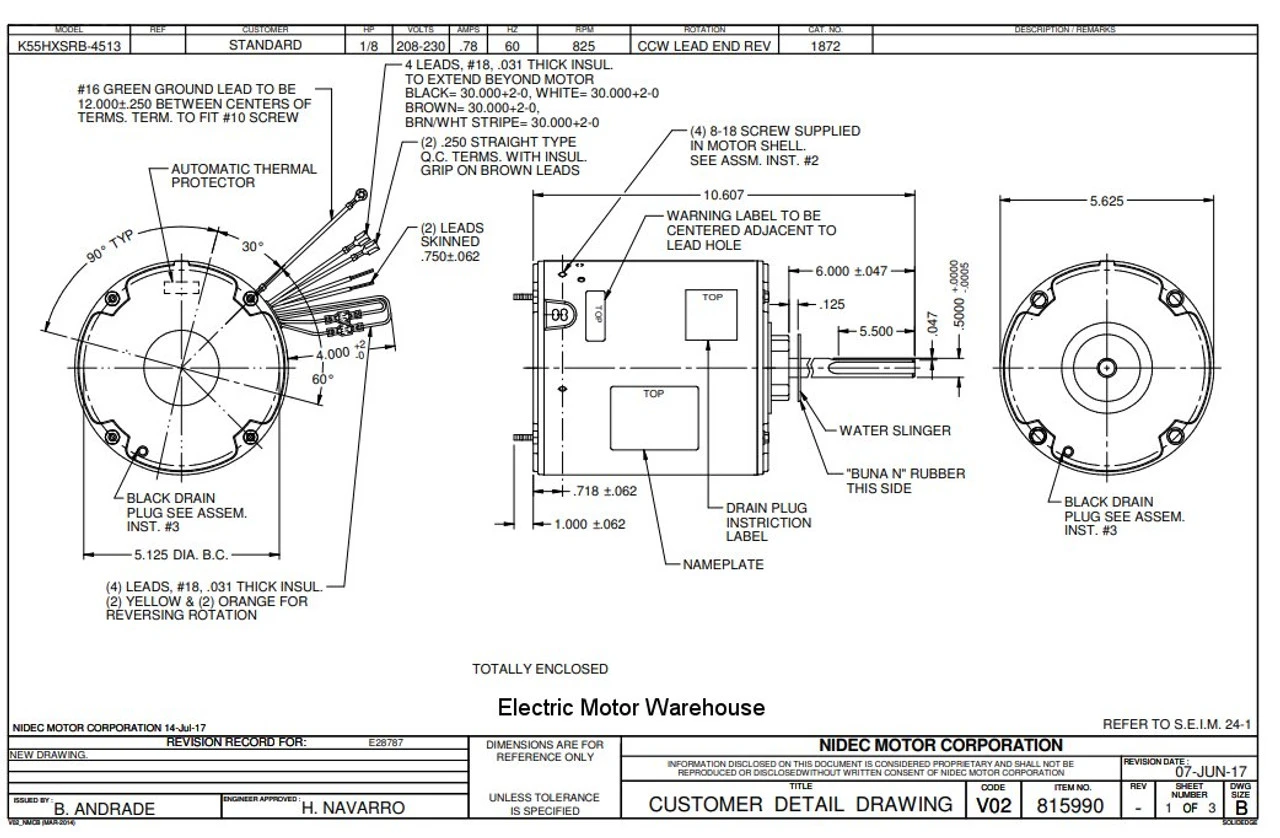 Permanent Split Capacitor Motor. Automatic Overload Protection. Continuous Duty; Totally Enclosed Air Over Enclosure; Class B Insulation; 60C Ambient Temperature; 30″ Leads, K055SRB4513862B