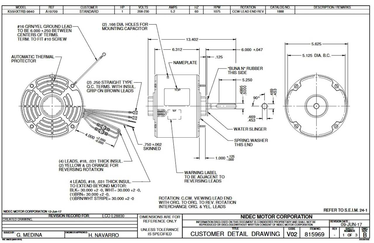 Permanent Split Capacitor Motor. Automatic Overload Protection. Continuous Duty; Open Drip-Proof Air Over Enclosure; Class B Insulation; 60C Ambient Temperature; 30″ Leads, K055TRB9840012B