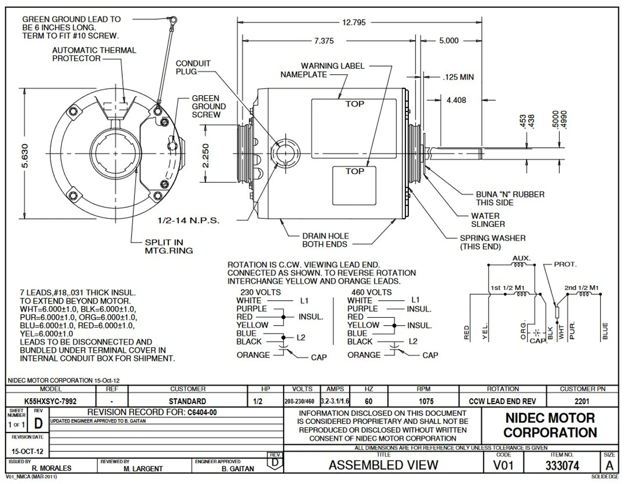 Permanent Split Capacitor Motor. Automatic Overload Protection. Continuous Duty; Totally-Enclosed Enclosure; Class B Insulation; 40C Ambient Temperature; K055SYC7992012B