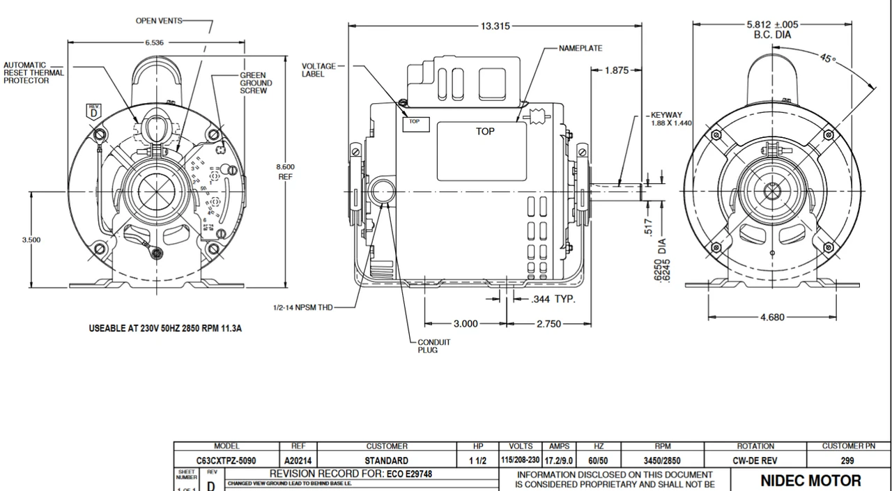 - 1 1/2 hp 3600 RPM (1 speed), 17.2/9.0 amps 115/208-230V Volts 60 Hz Capacitor Start Motor