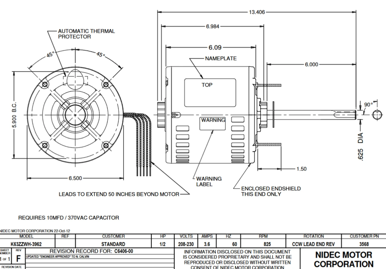 Replacement Condenser Fan Motor for certain brands. Wiring diagram on motor name plate. ODP = Open Drip Proof, K0630WH3962862B