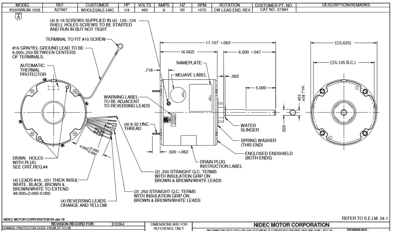 Condenser Fan Motor for hot environments. Wiring diagram on motor name plate. TEAO = Open Drip Proof, K055WJM1028014B