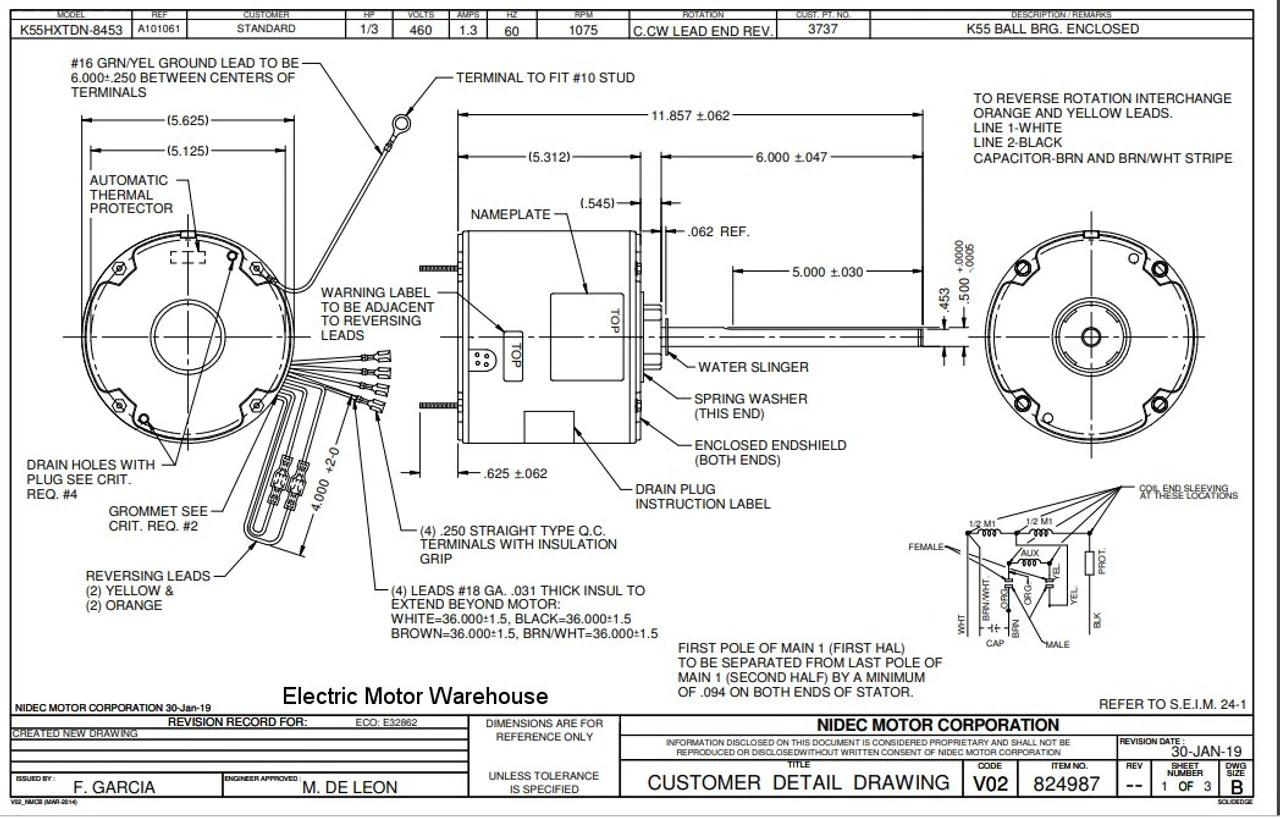 Permanent Split Capacitor Motor. Automatic Overload Protection. Continuous Duty; Totally Enclosed Air Over Enclosure; Class B Insulation; 60C Ambient Temperature; 30″ Leads, K055TDN8453014B