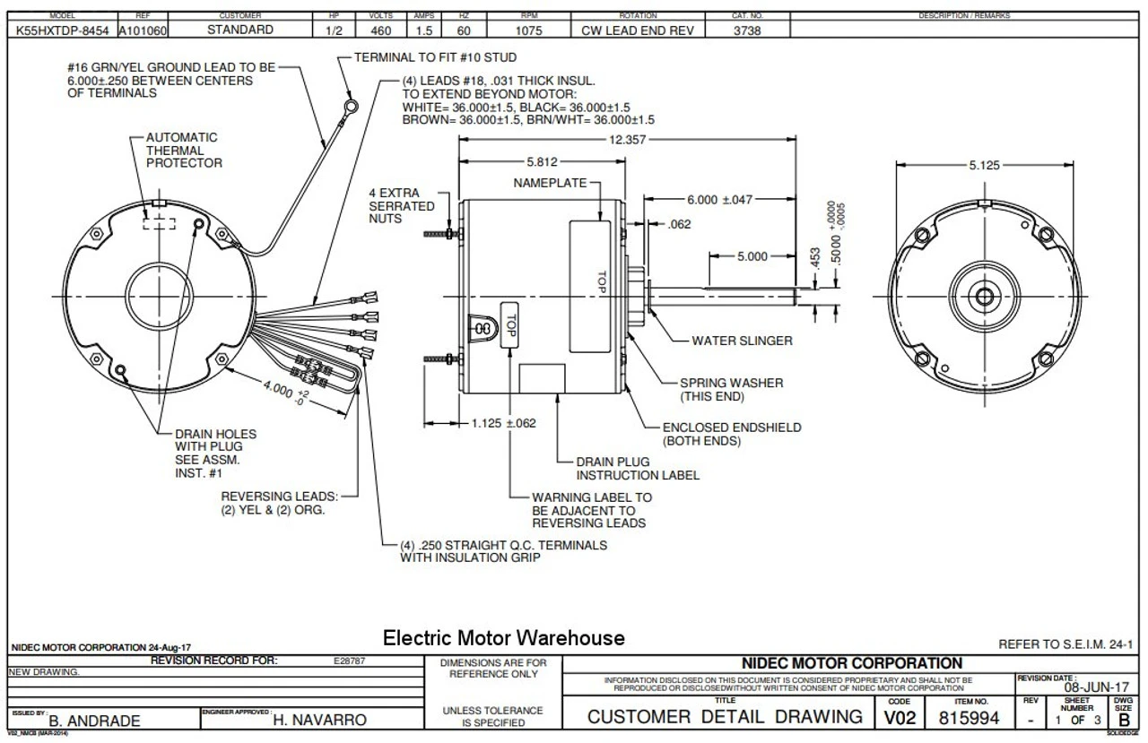 Permanent Split Capacitor Motor. Automatic Overload Protection. Continuous Duty; Totally Enclosed Air Over Enclosure; Class B Insulation; 60C Ambient Temperature; 30″ Leads, K055TDP8454014B