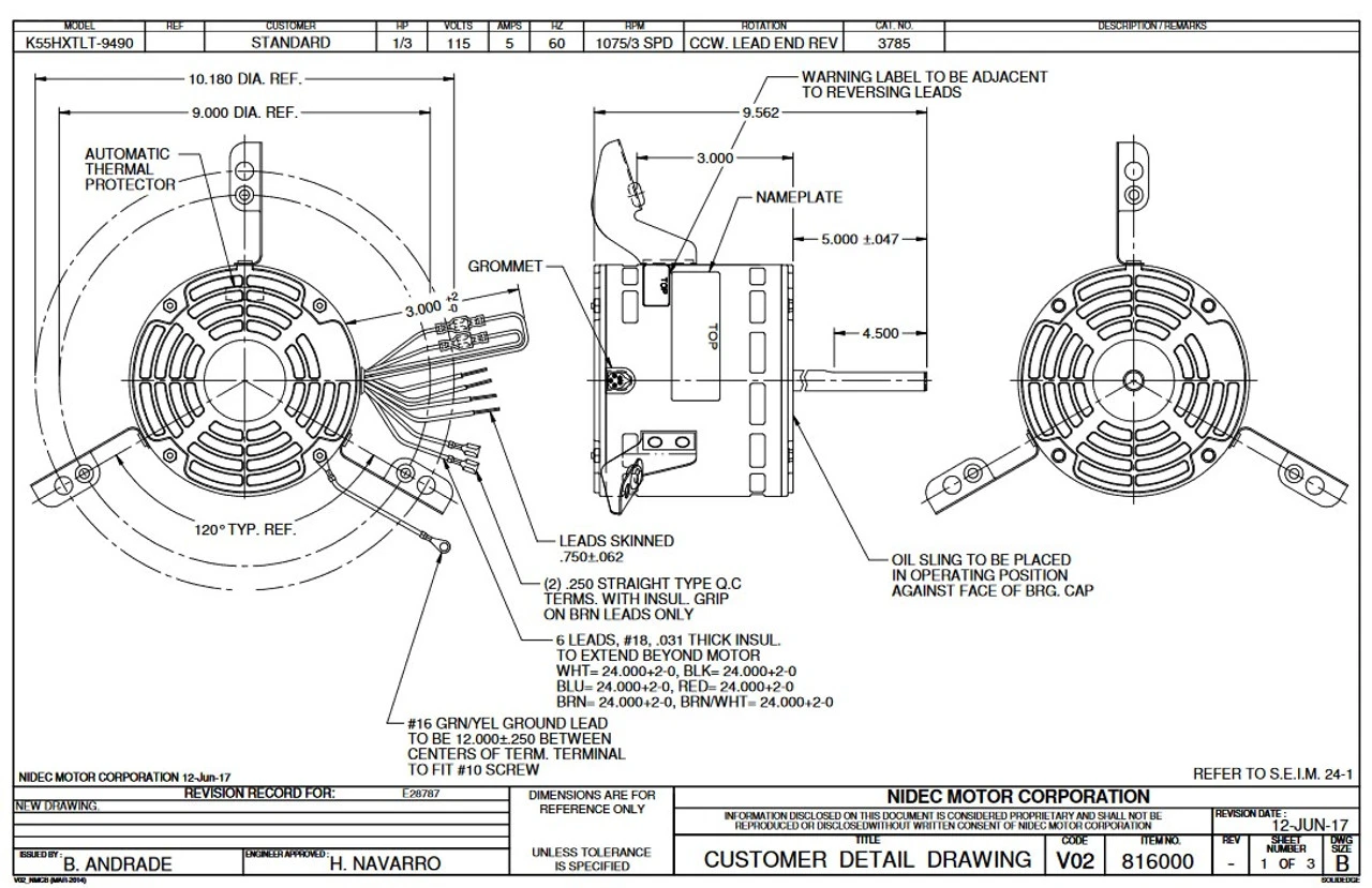 Permanent Split Capacitor Motor. Automatic Overload Protection. Continuous Duty; Open Air Over Enclosure; Class B Insulation; 40C Ambient Temperature; 24″ Leads, 60 Hertz. K055TLT9490012B.