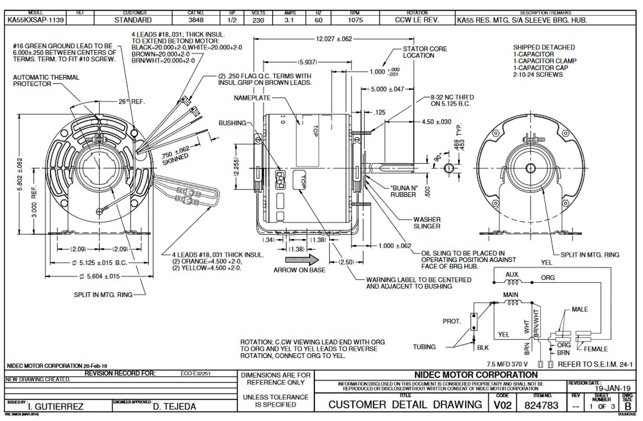 Permanent Split Capacitor Motor. Automatic Overload Protection. Continuous Duty; Open Drip-Proof Over Enclosure; Class B Insulation; 60C Ambient Temperature; 20″ Leads, KA55SAP1139802B