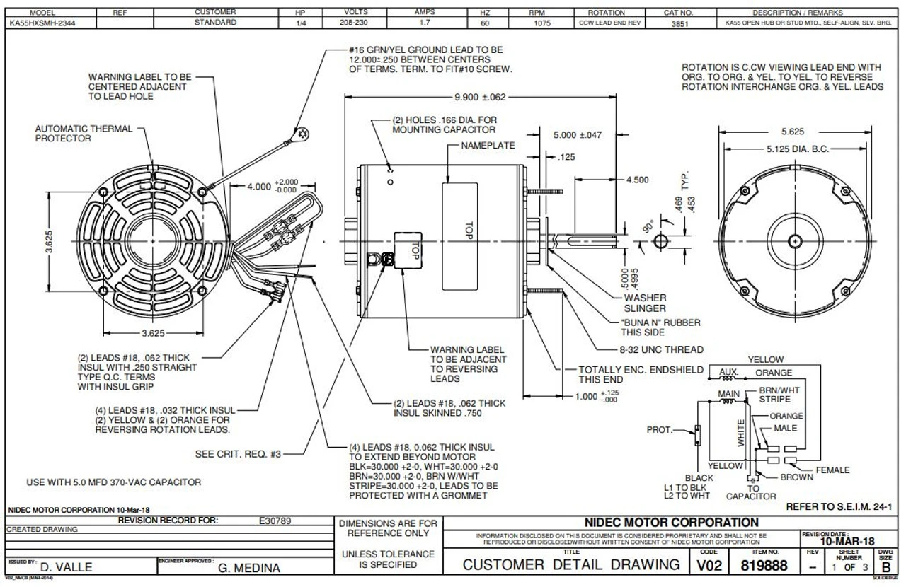 Permanent Split Capacitor Motor. Automatic Overload Protection. Continuous Duty; Open Drip-Proof Air Over Enclosure; Class B Insulation; 60C Ambient Temperature; 30″ Leads, KA55SMH2344862B