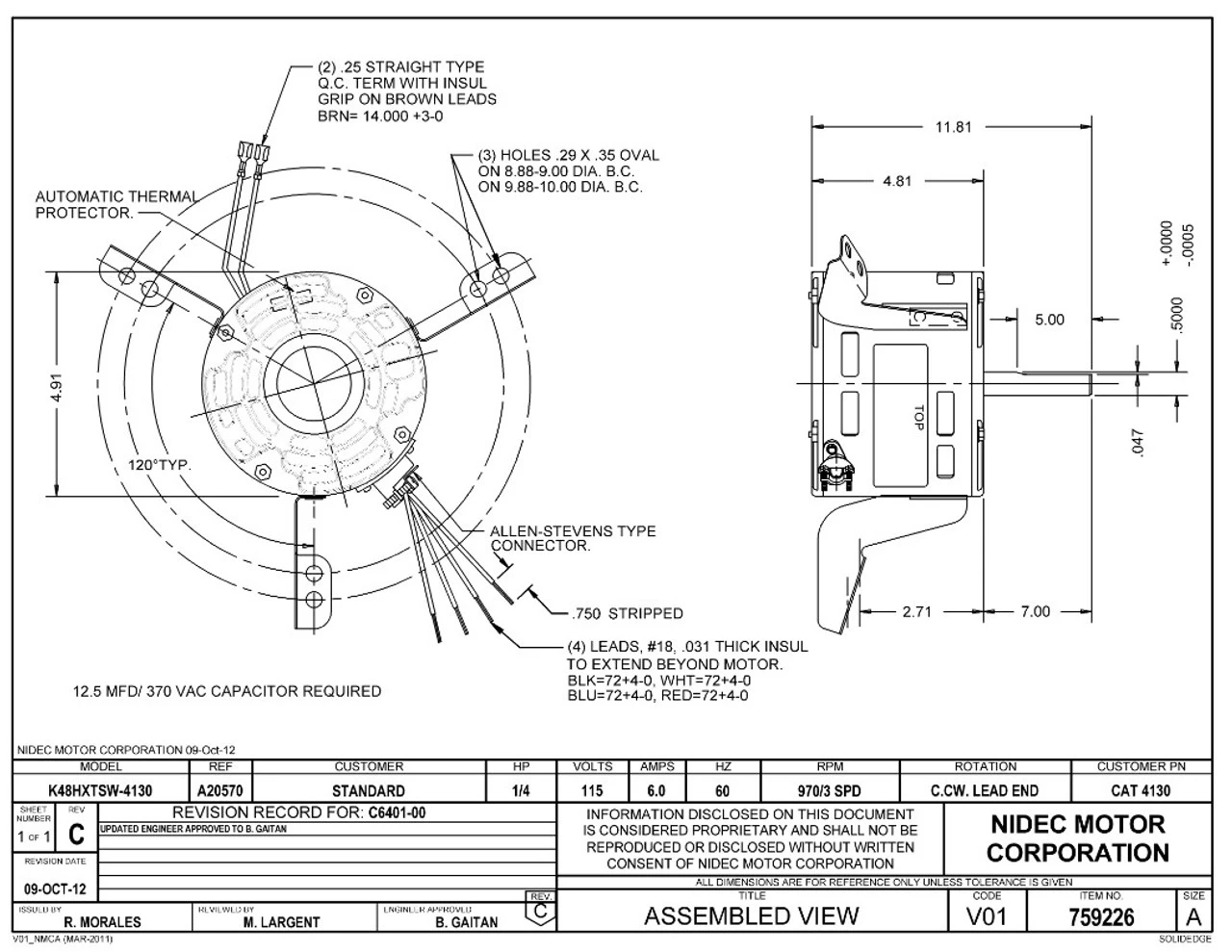 Permanent Split Capacitor Motor. Automatic Overload Protection. Continuous Duty; Open Enclosure; Class B Insulation; 40C Ambient Temperature. Application IEC application package terminal air conditioner.  K048TSW4130011B, Suggested after market replacement for 70021521, 700215-21 SKCP29MK6102S