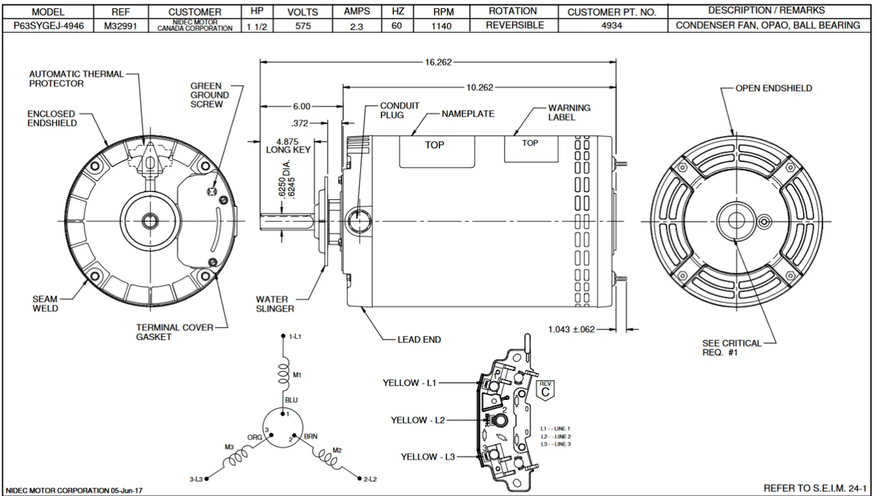 Commercial Condenser Fan Motor. Wiring diagram on motor name plate. OAO = Open Air-Over, P063GEJ4946015B