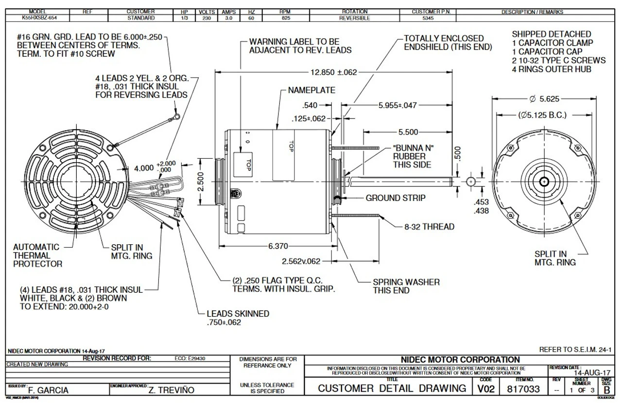 Permanent Split Capacitor Motor. Automatic Overload Protection. Continuous Duty; Open Drip-Proof Over Enclosure; Class B Insulation; 60C Ambient Temperature; 20″ Leads, K055SBZ0654802B