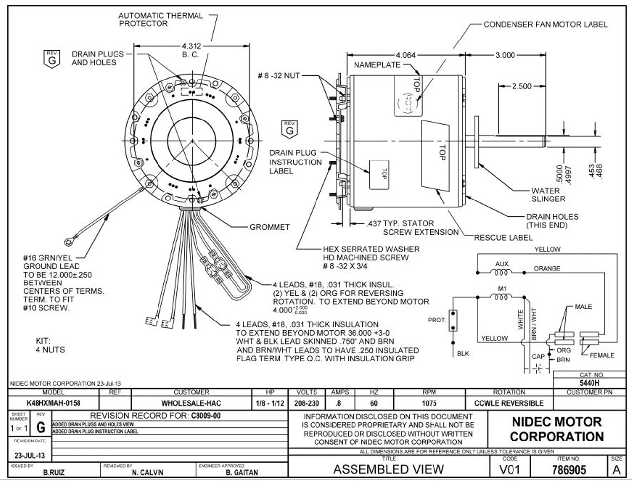Permanent Split Capacitor Motor. Automatic Overload Protection. Continuous Duty; Totally Enclosed Air Over Enclosure; Class B Insulation; 70C Ambient Temperature; 36″ Leads, 60 Hertz. K048MAH0158012B Application: Outside A.C. Condenser fan motors.