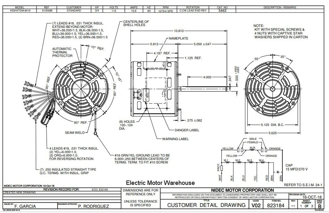Permanent Split Capacitor Motor. Automatic Overload Protection. Continuous Duty; Open Enclosure; Air Over; Class B Insulation; 40C Ambient Temperature; 36″ Leads. Application: Furnace blower motor. Includes 2.25″ Dia. hub rings with kit for 2.5″ included. Suggested after market replacement for Rheem K055TDM8416012B., K55HXPAD4962, 51-22700-01, 51-23017-42, K55WDRJ7033, HQ1010263EM, 5452