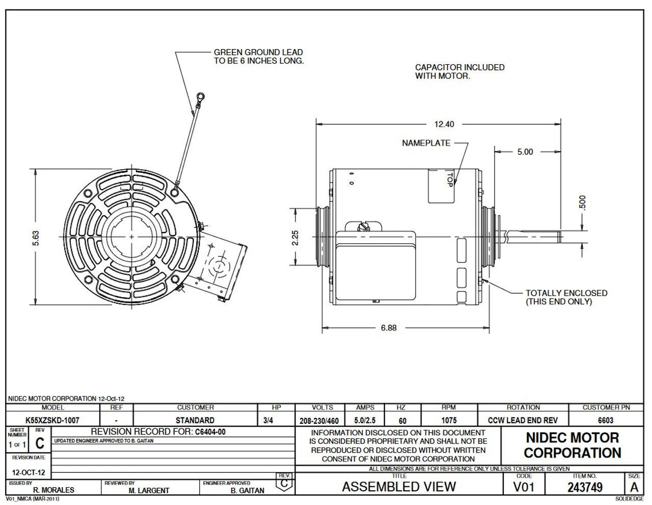Permanent Split Capacitor Motor. Automatic Overload Protection. Continuous Duty; Open Drip Proof Enclosure; Class B Insulation; 40C Ambient Temperature; Conduit box, K055SKD1007892B