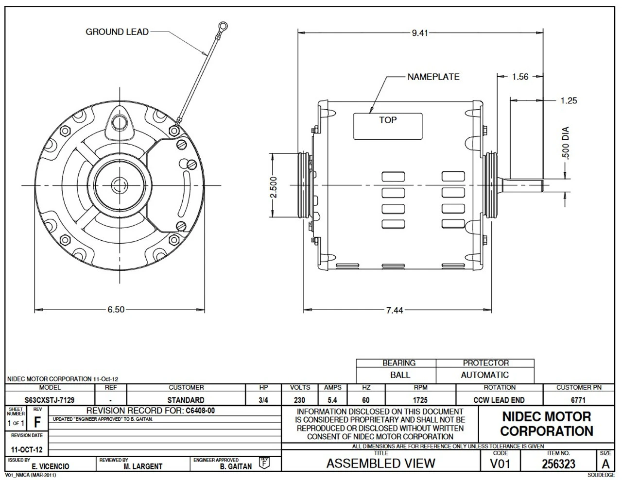 Split Phase Evaporative Cooler Motor. Automatic Overload Protection. Continuous Duty; Open Drip Proof Enclosure; Class B Insulation; 40C Ambient Temperature; 60 Hertz. S063STJ7129801B.