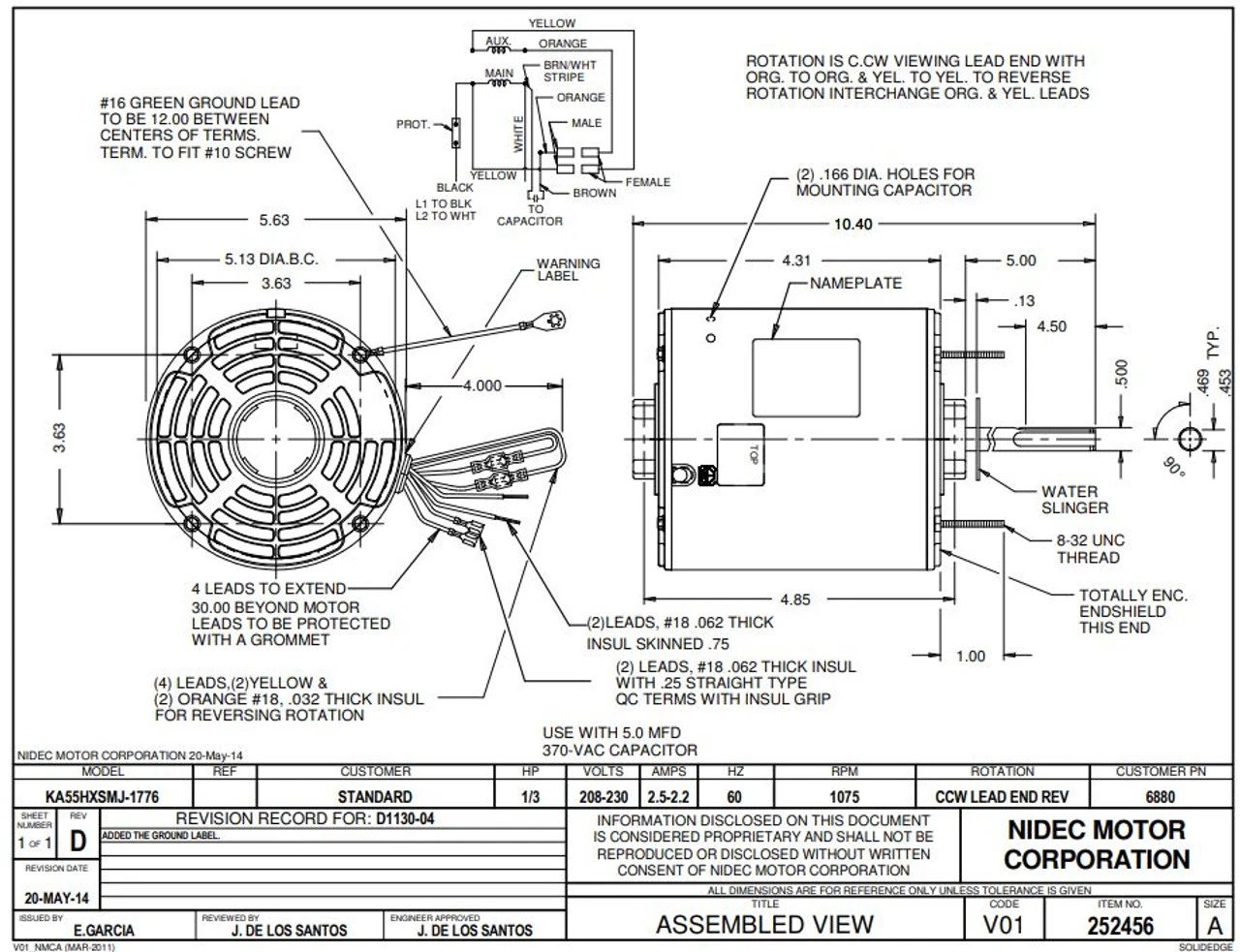 Permanent Split Capacitor Motor. Automatic Overload Protection. Continuous Duty; Open Drip-Proof Air Over Enclosure; Class B Insulation; 60C Ambient Temperature; 30″ Leads, KA55SMJ1776862B