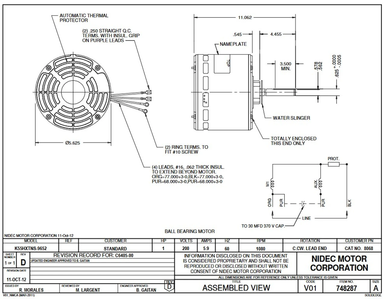 Permanent Split Capacitor Motor. Automatic Overload Protection. Continuous Duty; Open Enclosure; Class B Insulation; 40C Ambient Temperature. Application Lennox condenser fan motors. K055TNS9652011B, Suggested after market replacement for 88C7501, K55HXBSF-9468