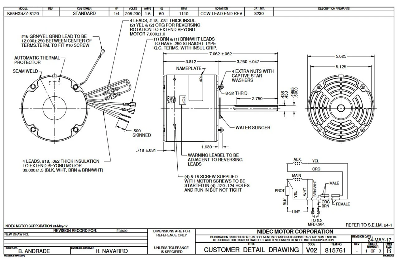 Permanent Split Capacitor Motor. Automatic Overload Protection. Continuous Duty; Open Drip-Proof Air Over Enclosure; Class B Insulation; 60C Ambient Temperature; 30″ Leads, K055SZZ8120012B