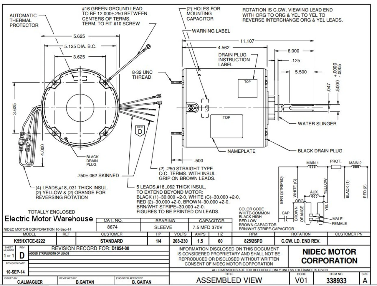 Permanent Split Capacitor Motor. Automatic Overload Protection. Continuous Duty; Totally Enclosed Air Over Enclosure; Class B Insulation; 60C Ambient Temperature; 30″ Leads, K055TCE8222012B