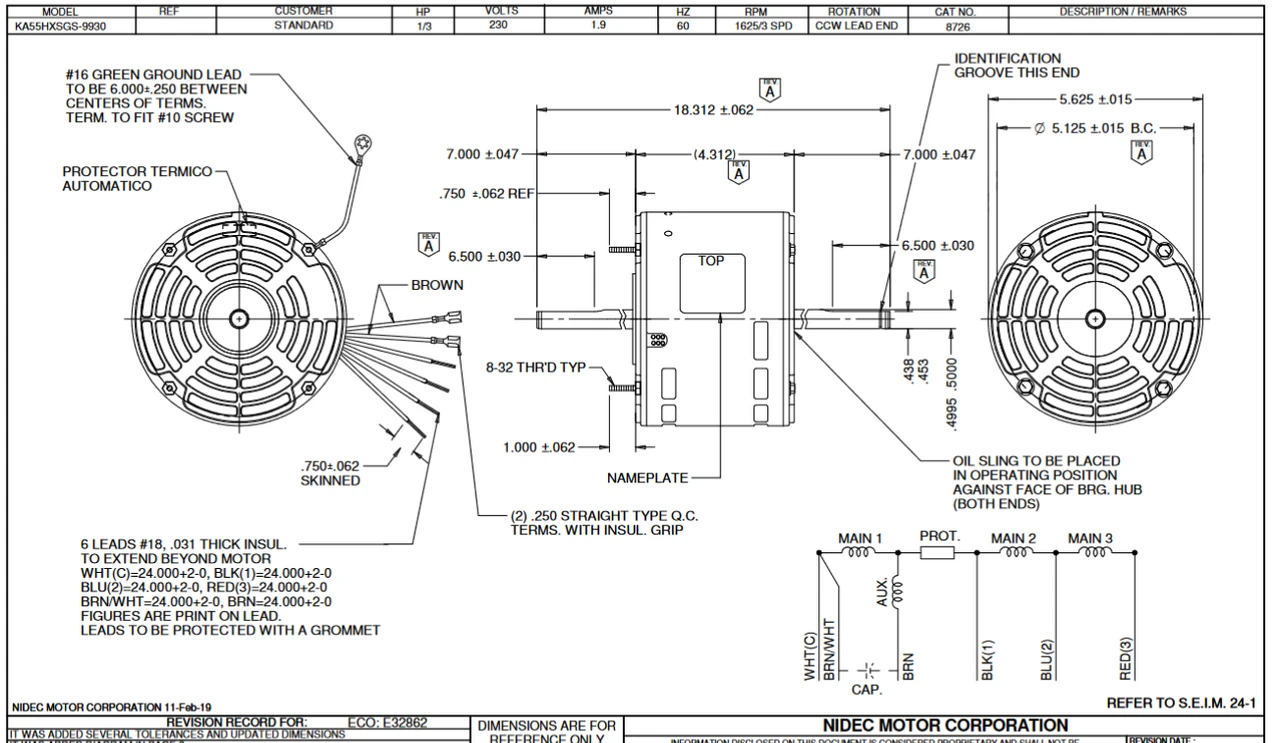 - 1/3 hp 1625 RPM, 3 speed 1.9 amps 230V Volts 60 Hz PSC Motor