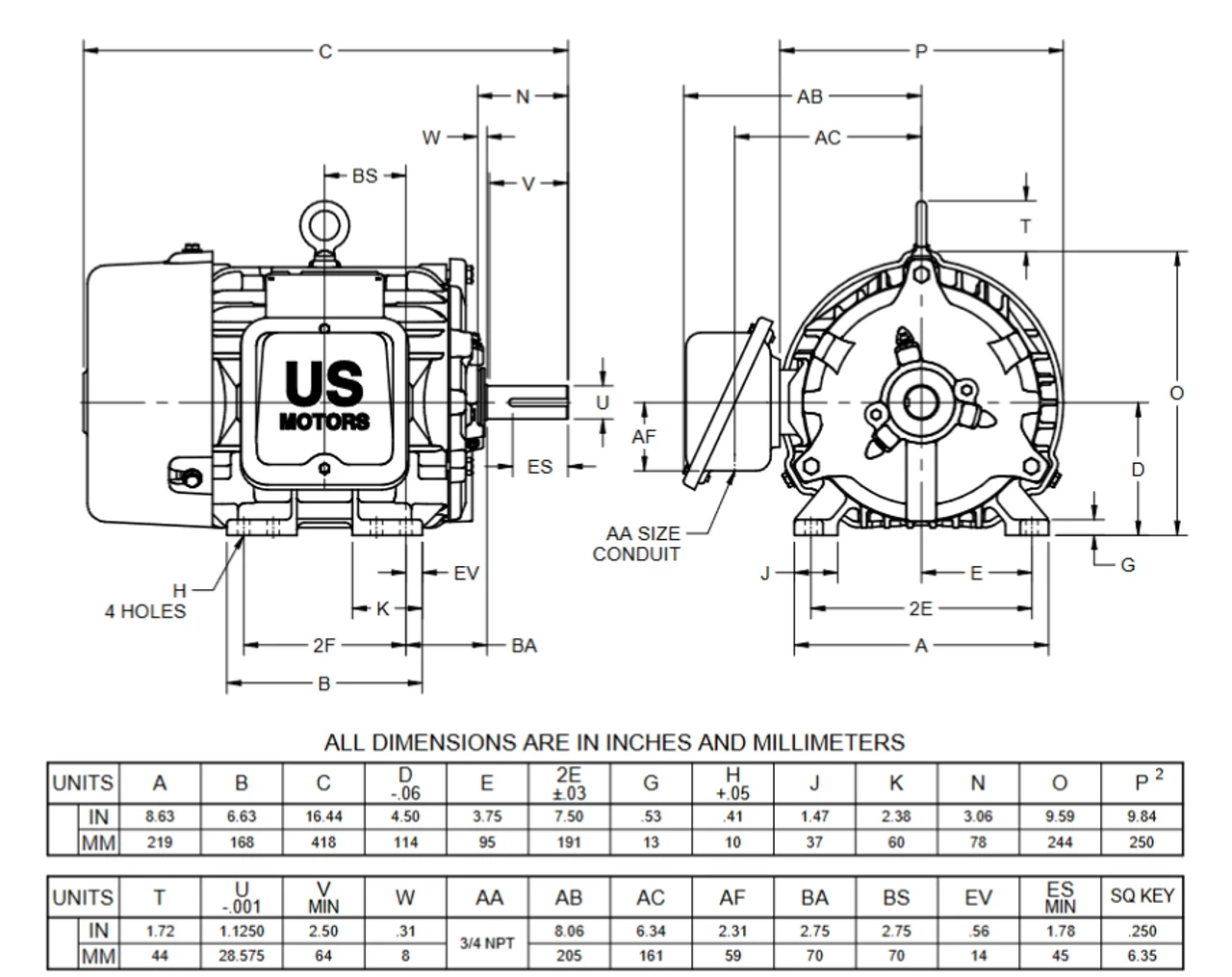 - NEMA 182T Cast Iron Frame, Keyed Shaft 1 1/8″ Diameter x 2 3/4″