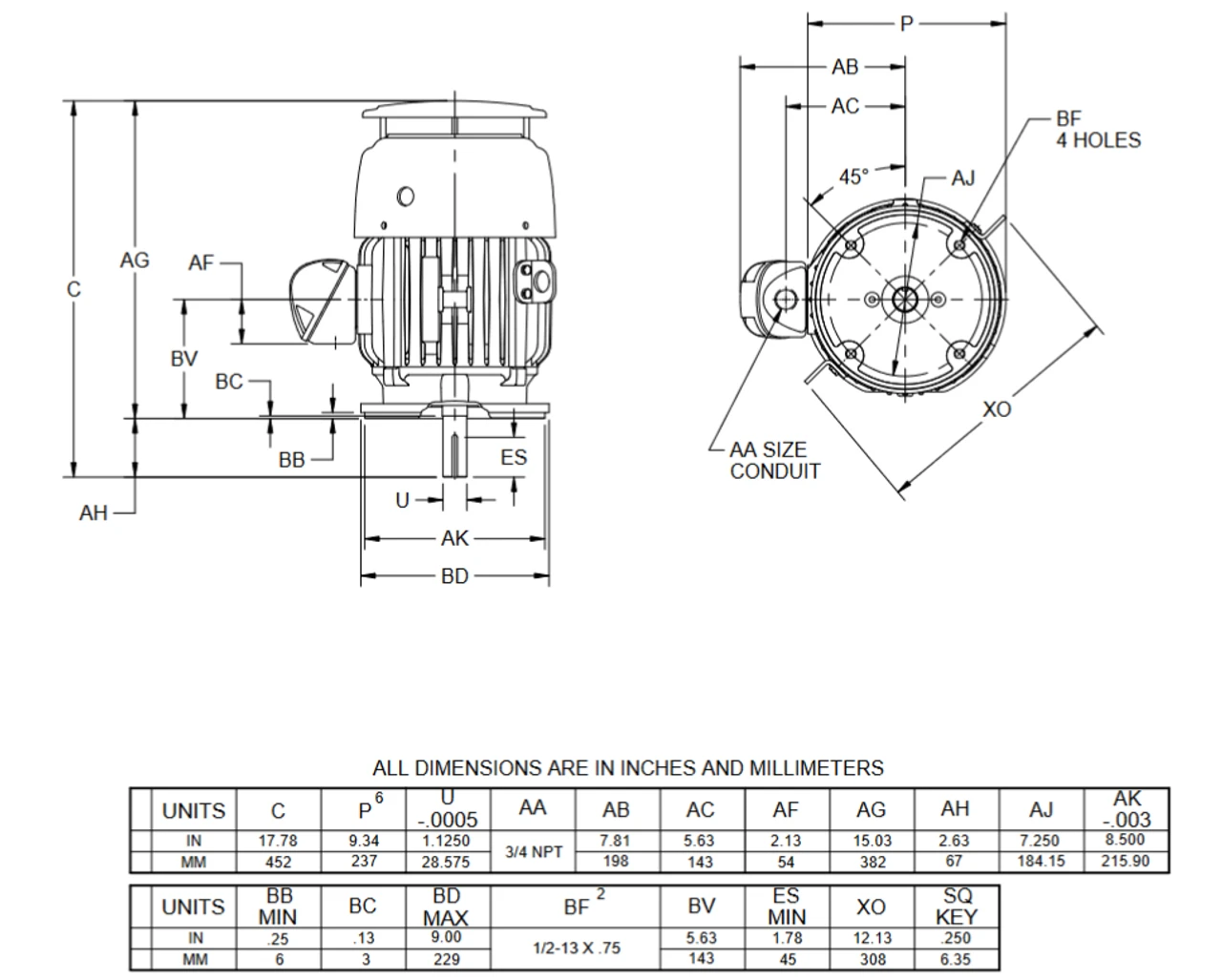 - NEMA 182TC cast iron frame, Keyed Shaft 1 1/8″ Diameter x 2 3/4″