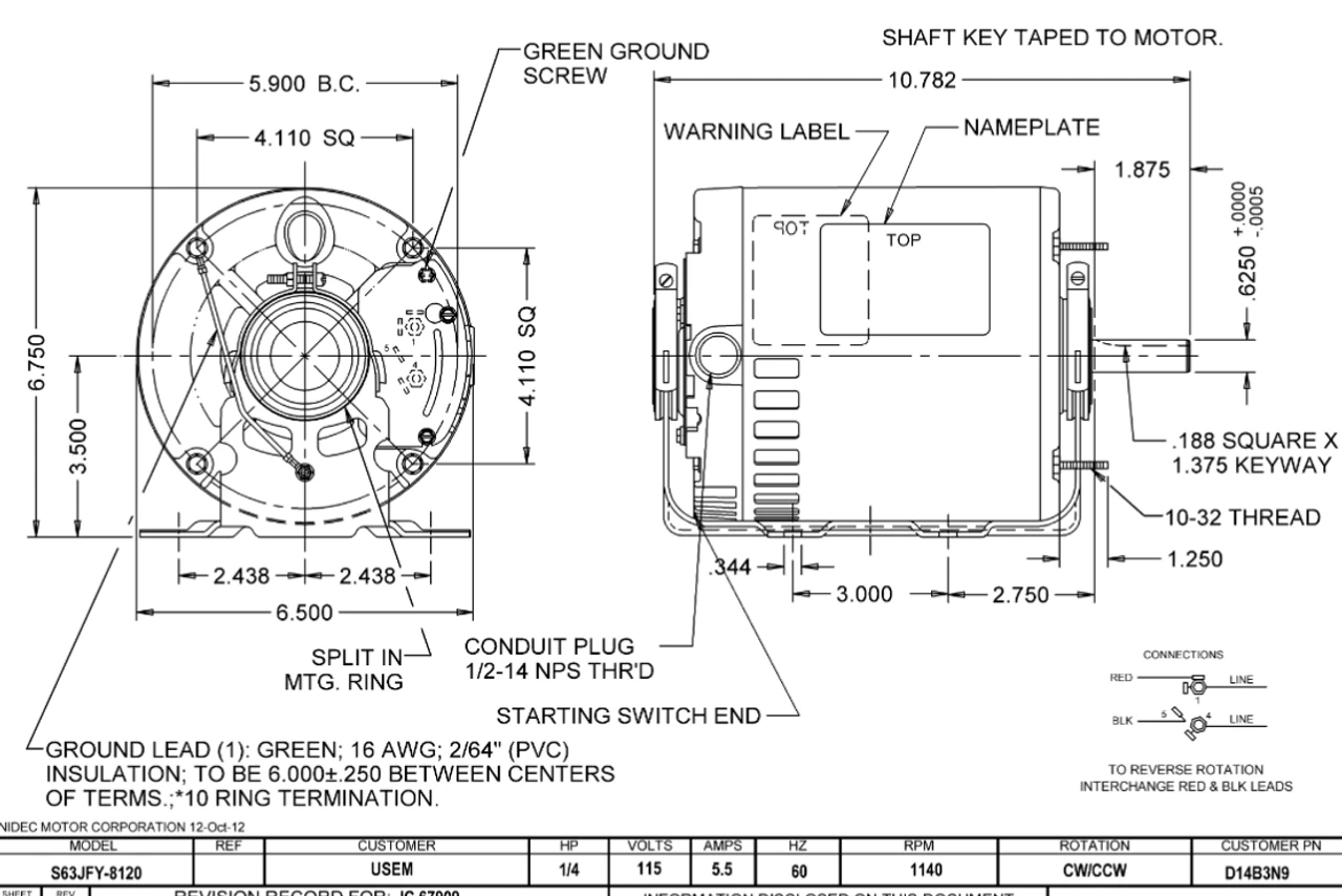 - 1/4 hp 1200 RPM, 5.5 amps 115 Volts 60 Hz Split Phase Motor