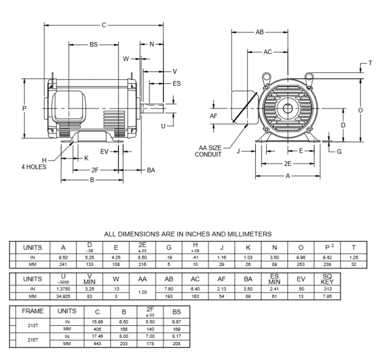 - NEMA 213T Rolled Steel Frame, Keyed Shaft 1 3/8″ Diameter x 3 3/8″