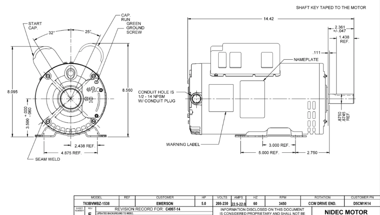 - 5 HP 3600 RPM (1 speed), 22.0 amps 208-230V Volts 60 Hz Capacitor Start/Run Motor