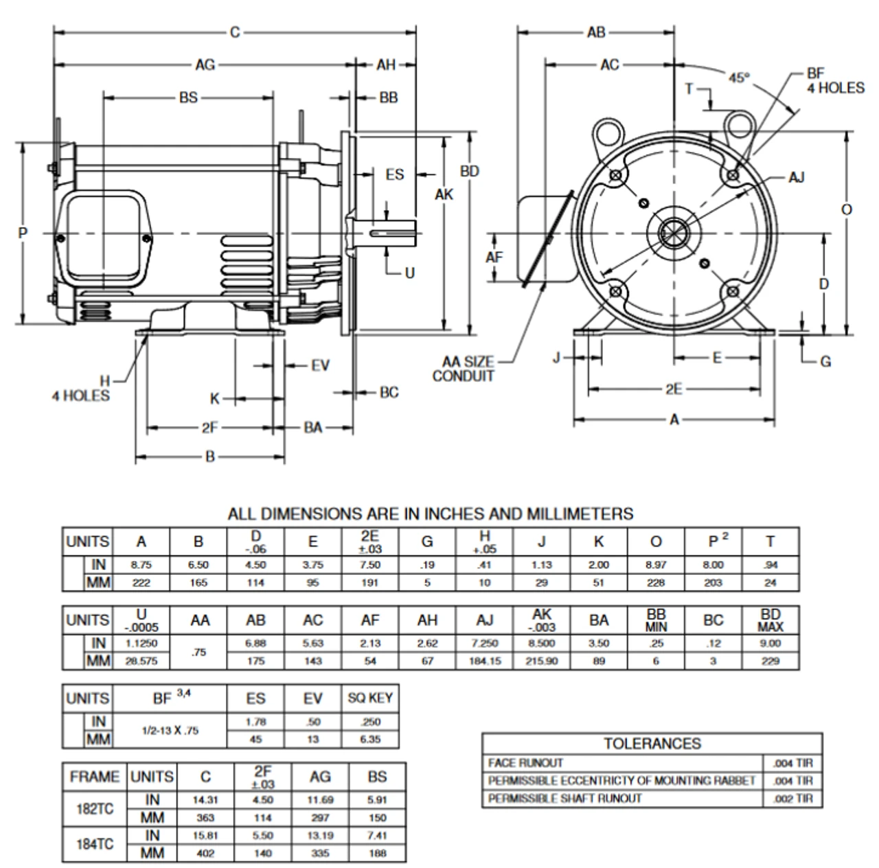 - NEMA 184TC frame Keyed Shaft 1 1/8″ Diameter x 2 3/4″