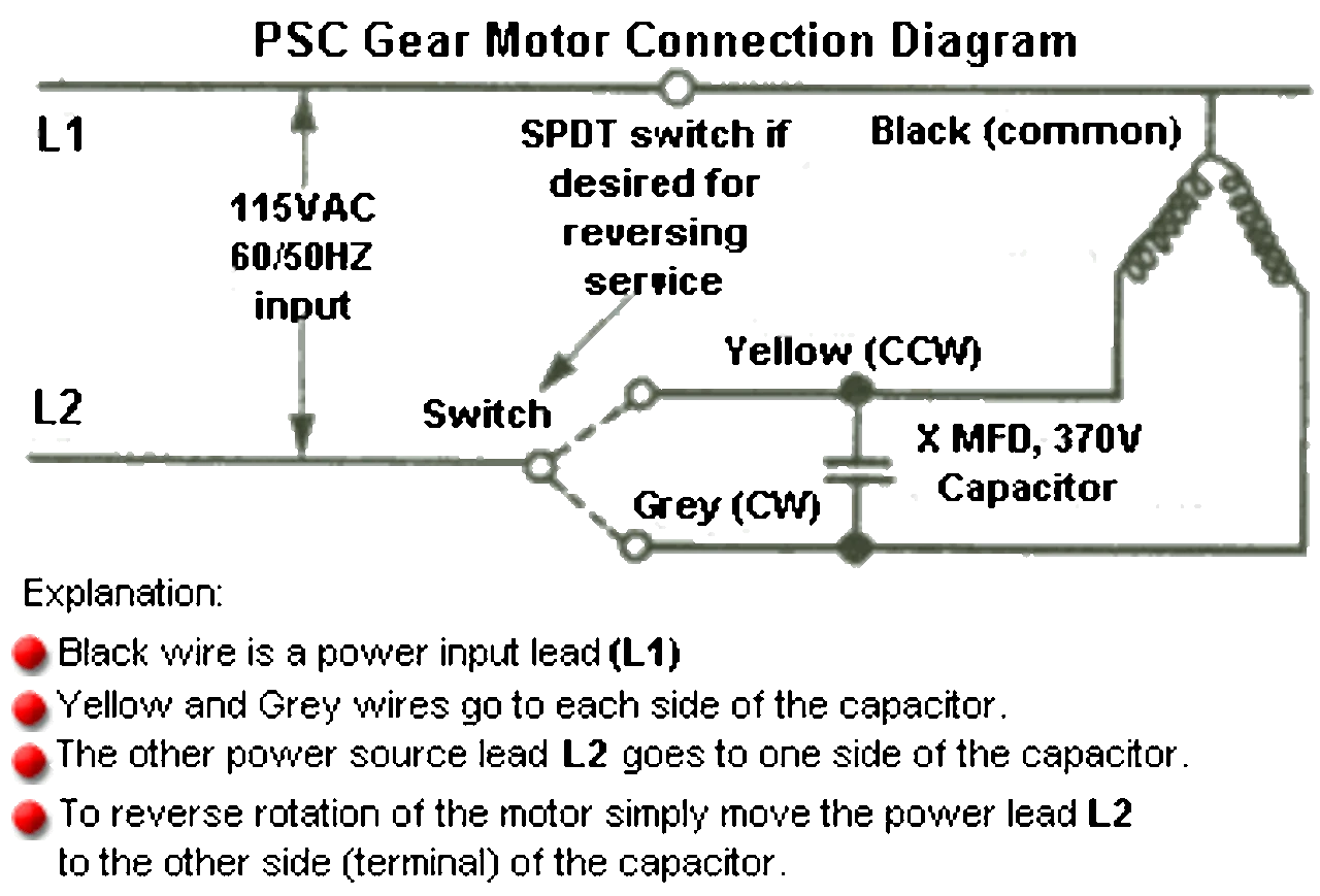 QGM-5004-3 Requires 4MFD 370 volt capacitor (included). Mounting = Output Shaft Horizontal Only. Thermal Protection = Auto