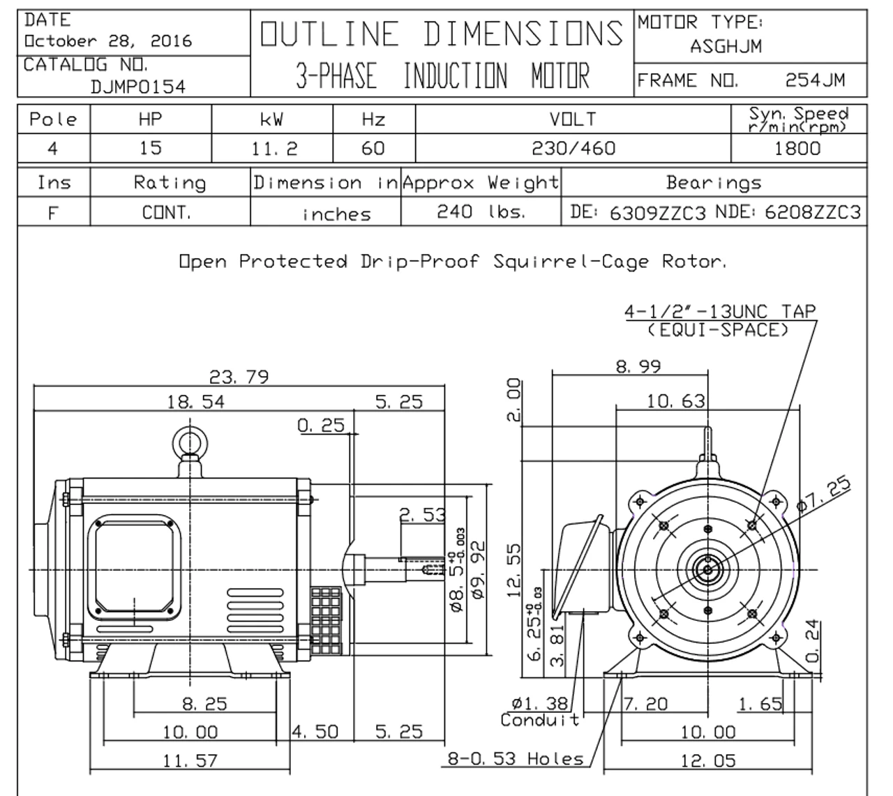 - 15 hp 1800 RPM, 36.4/18.2 amps 230/460 Volts 60hz. Three Phase