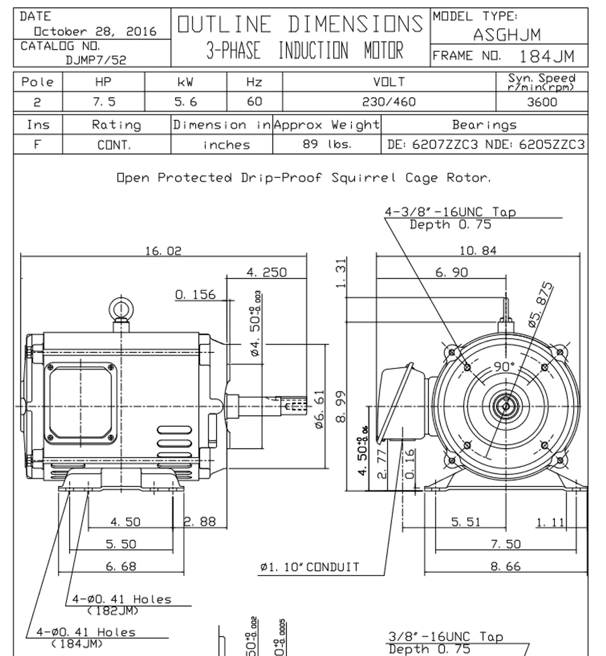 - 7 1/2 hp 3600 RPM, 17.6/8.8 amps 230/460 Volts 60hz. Three Phase