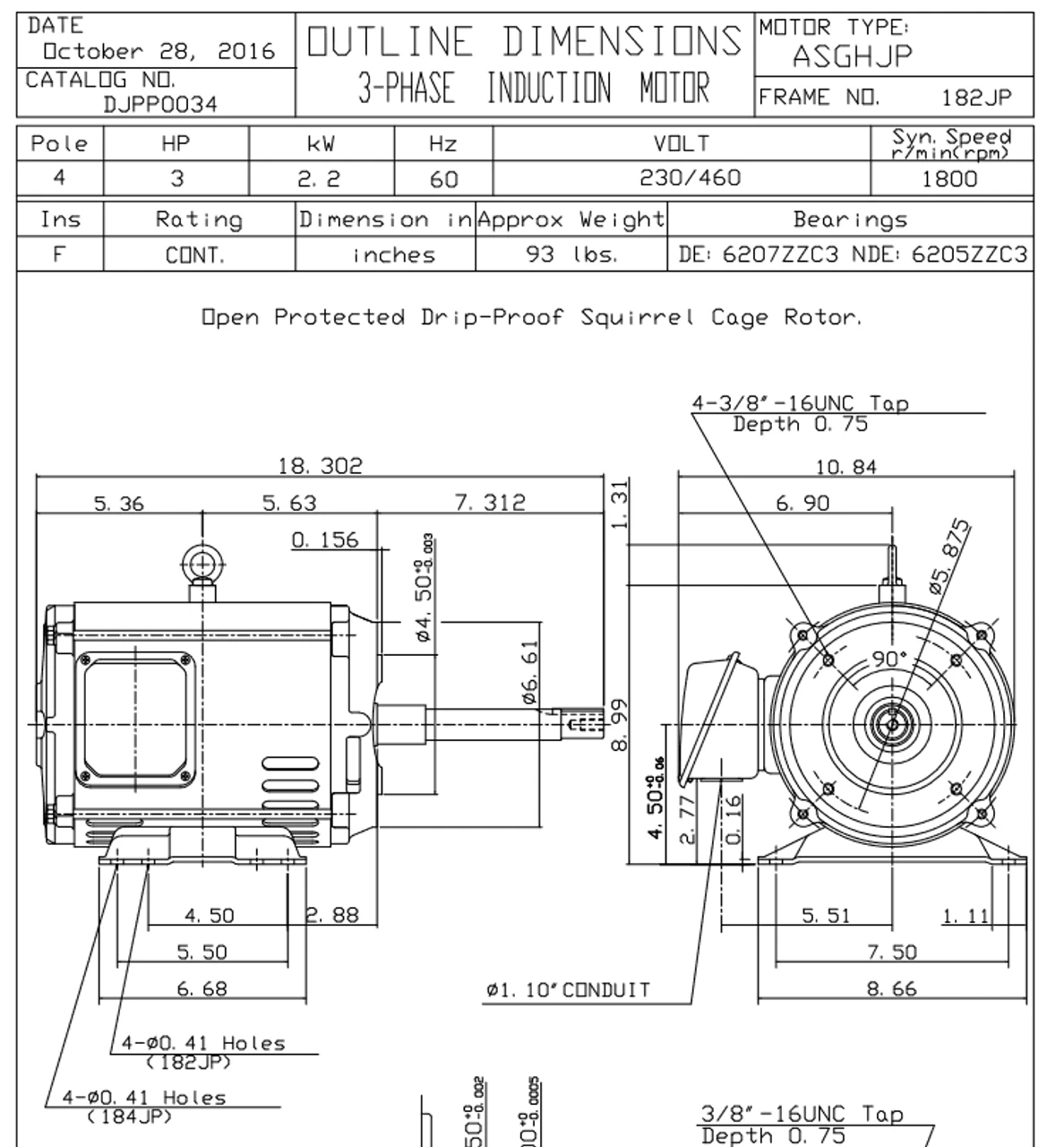 - 3 hp 1800 RPM, 8.6/4.3 amps 230/460 Volts 60hz. Three Phase