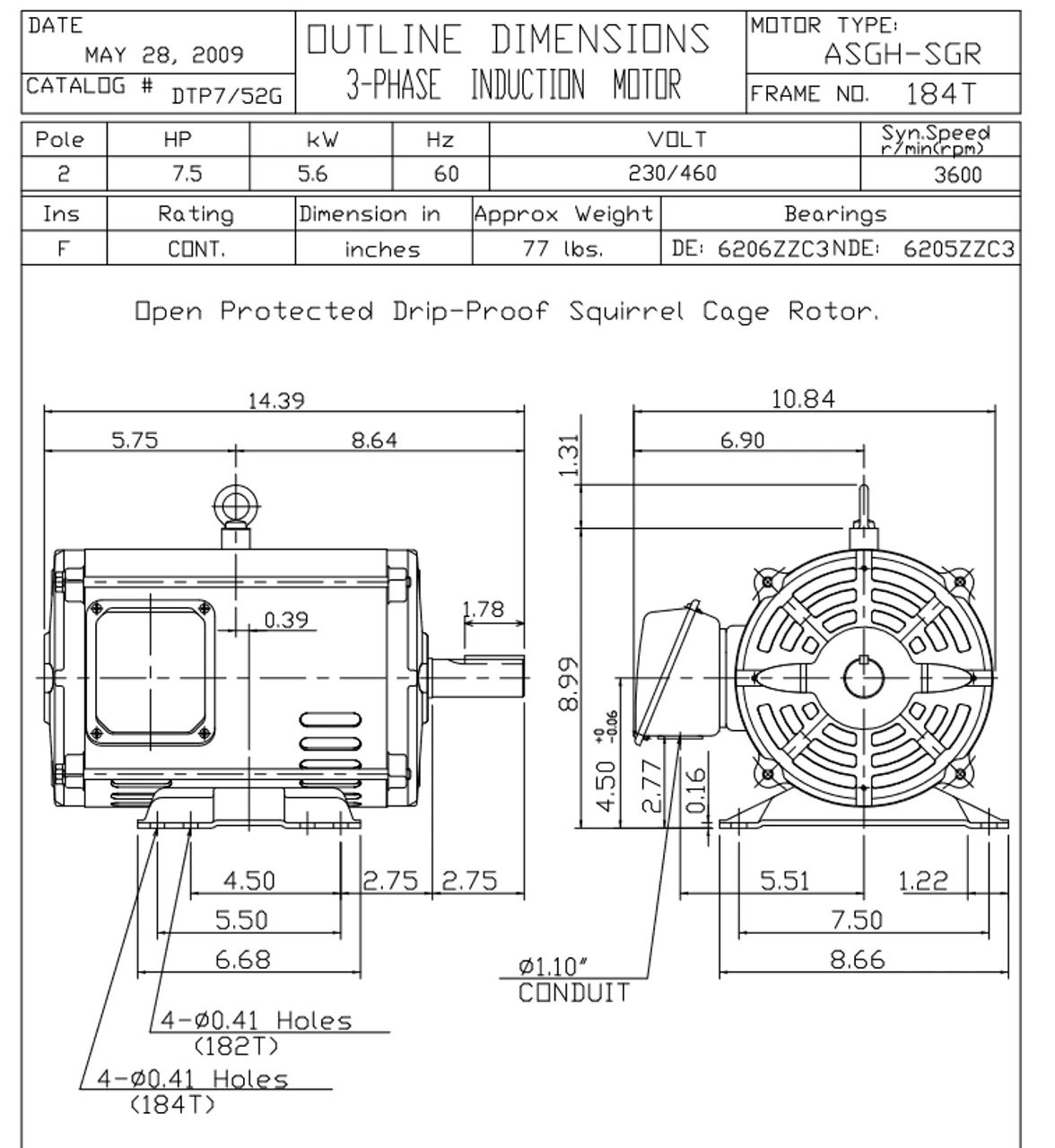 - 7 1/2 hp 3600 RPM, 17.6/8.8 amps 230/460 Volts 60hz. Three Phase
